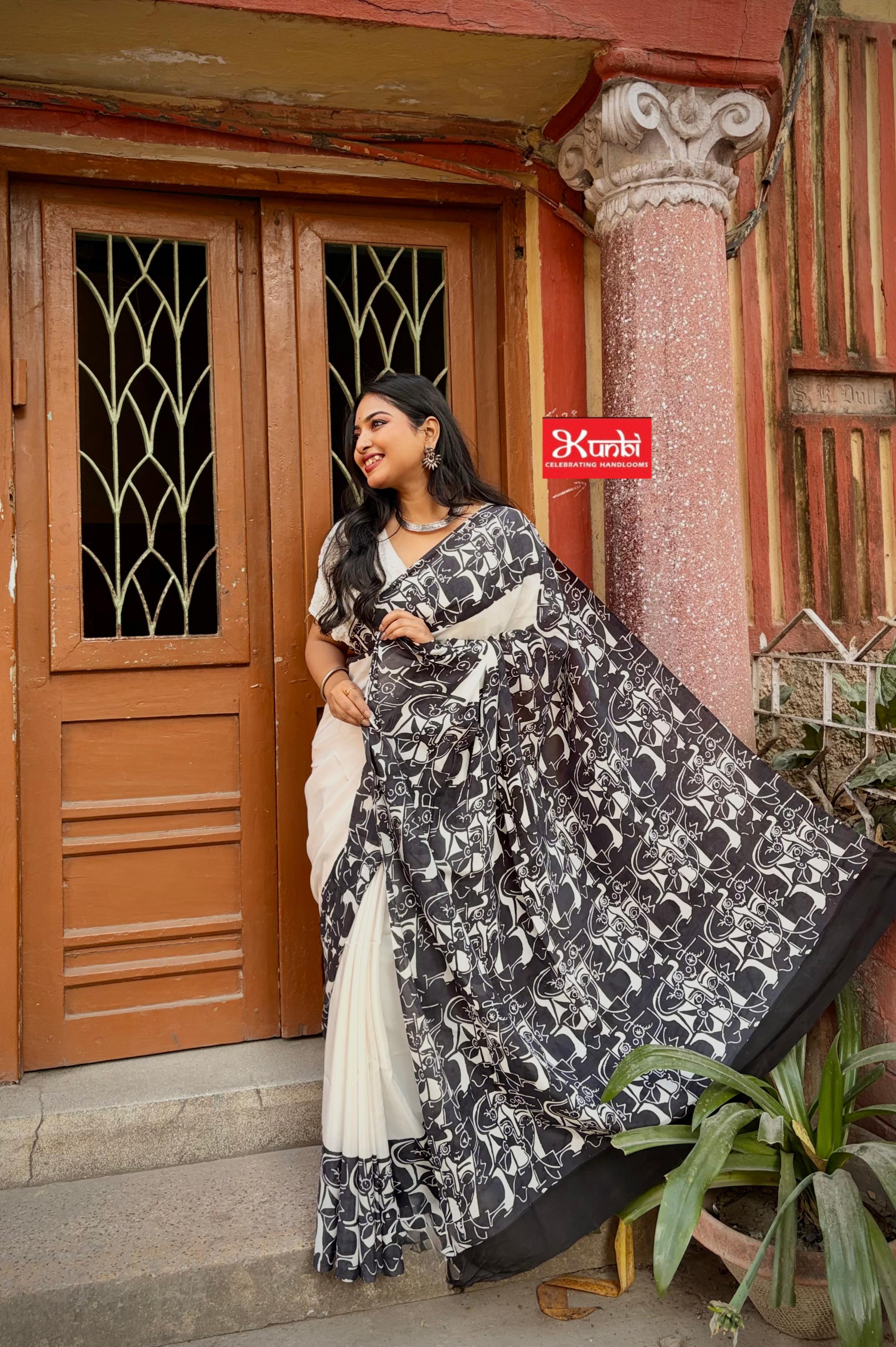 black and white scripted bishnupuri silk saree